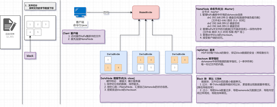:数据块,完整数据的最小组成部分,大小为128MB注意:拆分太少,导致单体文件过大,无法并行io操作文件,效率低。拆分太多,导致io次数过多,降低效率。 Client