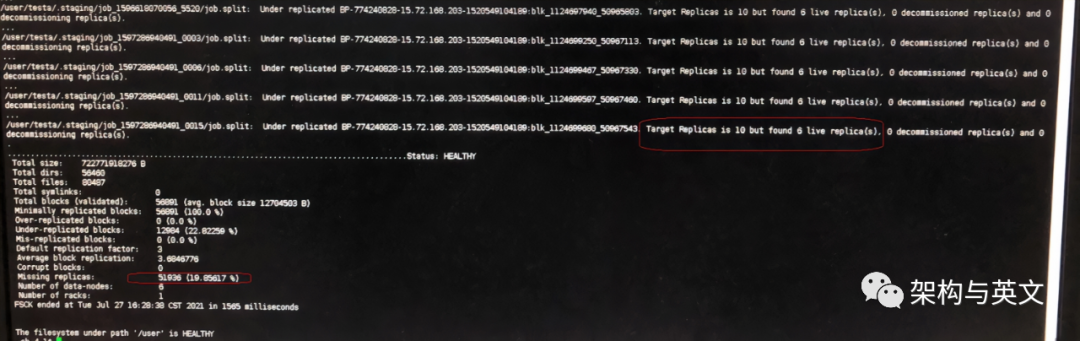 步骤二、 从上图红色框圈住的地方可以看出,正是这个目录下的blocks发生了缺失,不是HDFS web界面导致。“Target Replicasis 10 but found 6 live replicas”这句话说明这些目录的blocks需要10个副本但是只找到了6个,当前集群的datanode个数也是6,也就是还有4个副本永远不会被复制,正解释了为什么blocks会一直处于复制中的原因。
