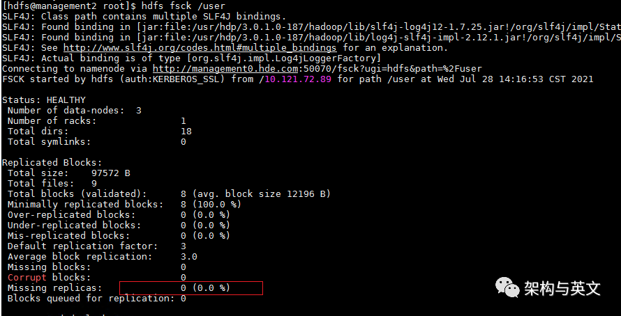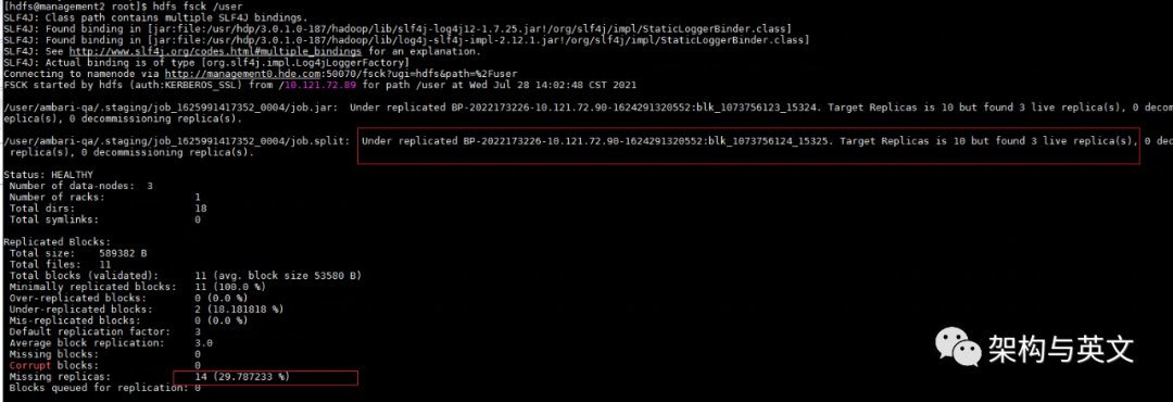 3、任务结束后再次执行:hdfs fsck user 服务监控检查;