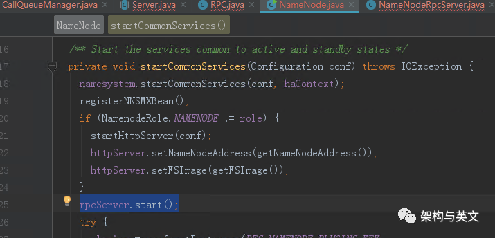 我们可以选择从NamNode源代码的startCommonServices函数做为切入点。如图: