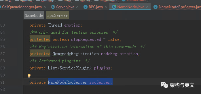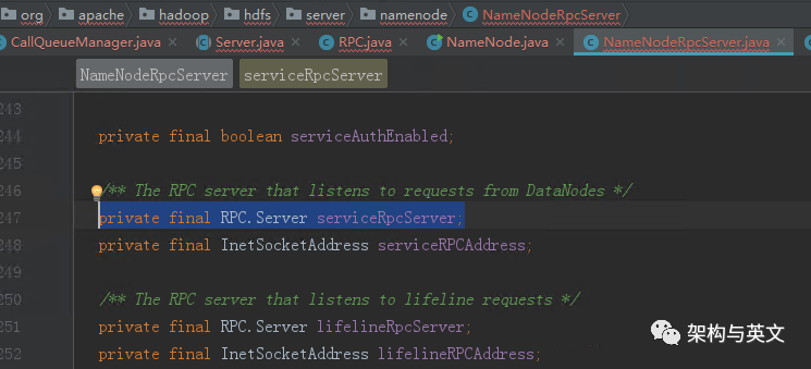 从该代码我们看到rpcServer的出现,然后我们继续找到该成员变量的定义处,可以看到其实它是一个NameNodeRpcServer实例: