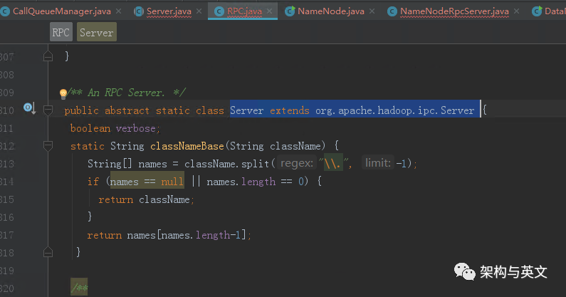 其是一个RPC的内部类Server的实例。继续跟踪代码,到了Server定义处: