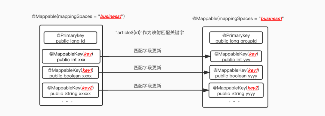 以命名空间+指定字段值 为key,匹配相同注解名的字段的映射,打平了Model类型的不同、层级嵌套的约束; 直接更新结果到数据model(如article),与数据model视角的同步; 打平了多个页面、复杂view层级嵌套的差异; 自动处理更新,使用者仅需要关心怎么更新UI,不需要考虑数据Model的一致性; 任意场景的支持。
