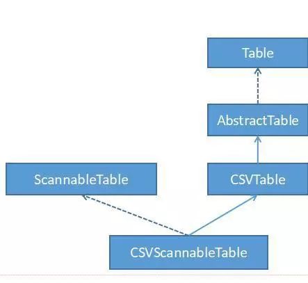 如图可知,CSVScannableTable主要实现了两个接口ScannableTable和Table。右边部分,CSVTable实现了Table接口,它的作用是定义Table的字段以及字段类型,左侧的ScannableTable是实现如何遍历读取CSV文件的数据。Table接口有如下三个方法: