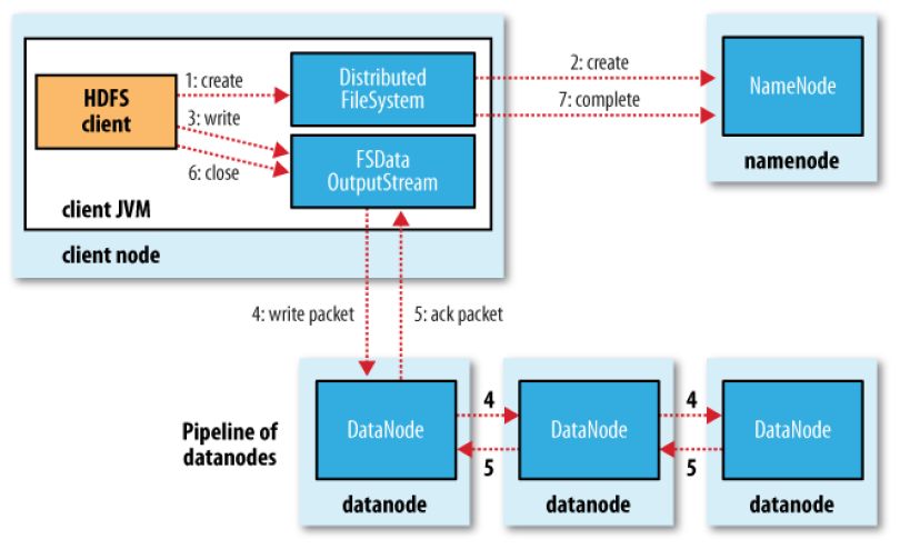 (3)如果是写操作,首先将返回的LocatedBlock中所有DataNode建立数据管道(Pipeline),然后开始向数据管道里写数据,若写出的数据不能在一个Block内完成,再次向NameNode申请LocatedBlock,直到所有数据成功写出;