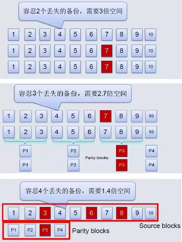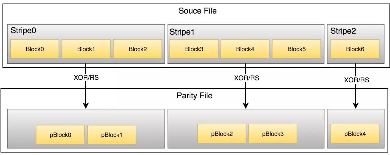 Erasure Code是用来encoding和decoding的算法。当前RAID中有两种实现:XOR和Reed Solomon。XOR只能允许丢失一块数据,而RS可以容忍丢失多块。RS默认采用(10,4)策略实现,即10个数据块生成4个parity file,那么可以容忍丢失4块数据。