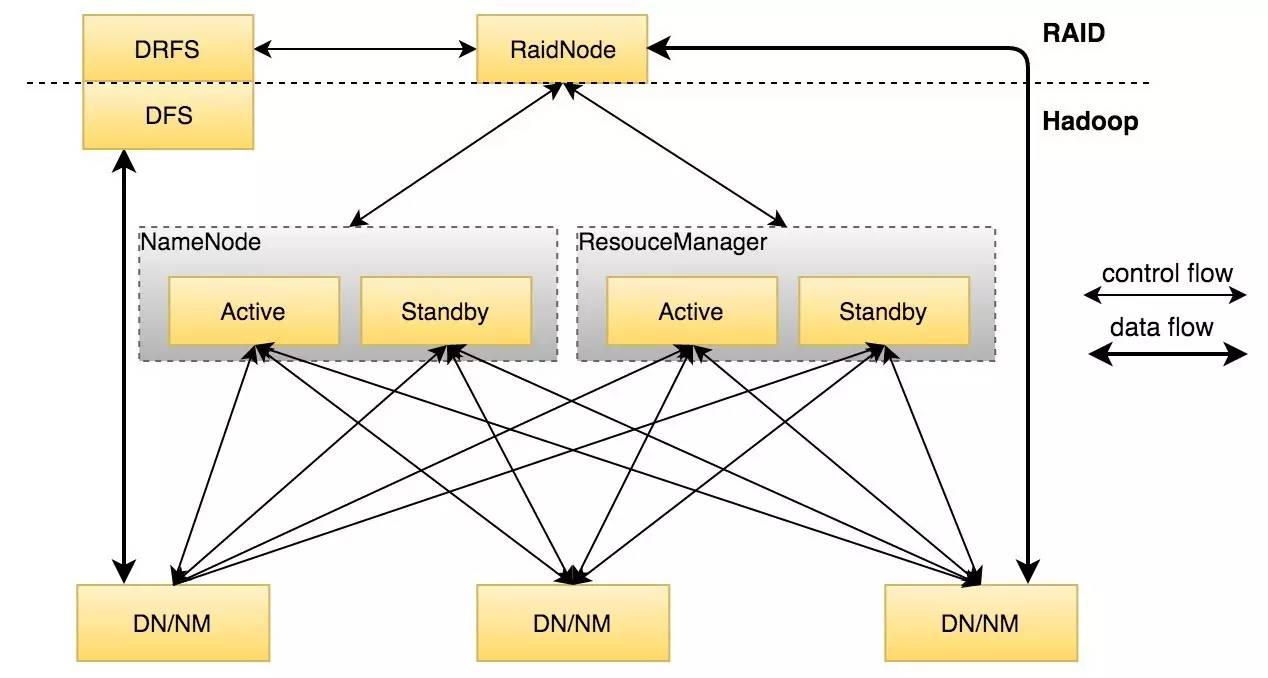 HDFS RAID的核心分成两个模块:RaidNode和DRFS(Distributed Raid File System)。HDFS RAID的架构如图2。