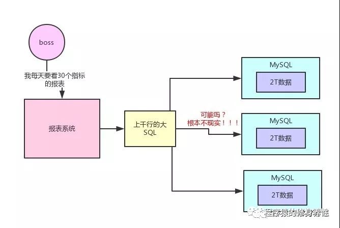 某天早上,boss来了,要看一张报表,比如要看每天网站的X指标、Y指标、Z指标等等,二三十个数据指标。好了,现在你尝试去从那些点击、购买、浏览的日志里,通过写一个SQL来分析出那二三十个指标试试看?绝对会写出来一个几百行起步,甚至上千行的超级复杂大SQL,这个SQL,你觉得它能运行在分库分表后的3台MySQL服务器上么?