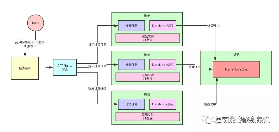 这个,绝对比你针对分库分表的MySQL来跑几百行大SQL要靠谱的多。对于上述所说的分布式存储与分布式计算,如下图。