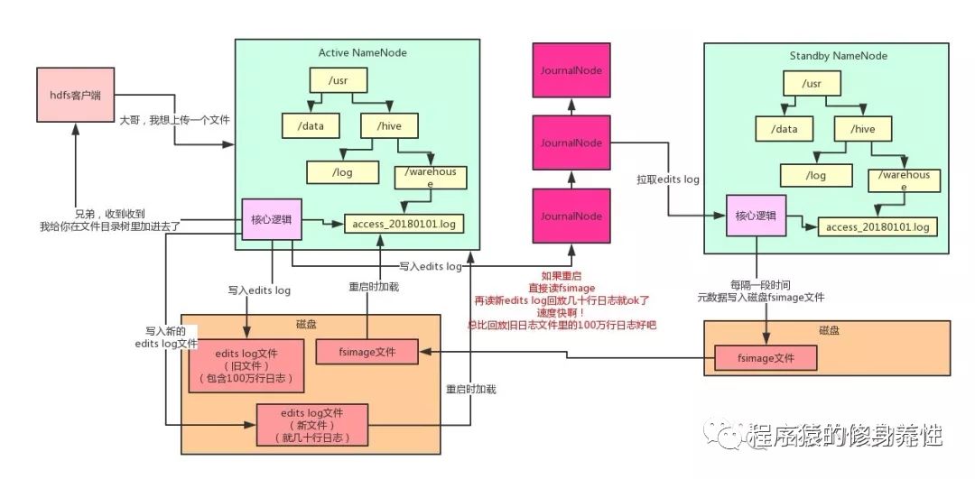 但是问题又来了,那edits log如果越来越大的话,岂不是每次重启都会很慢?因为要读取大量的edits log进行回放以恢复元数据!所以HDFS说,我可以这样子啊,我引入一个新的磁盘文件叫做fsimage,然后呢,再引入一个JournalNodes集群,以及一个Standby NameNode(备节点)。每次Active NameNode(主节点)修改一次元数据都会生成一条edits log,除了写入本地磁盘文件,还会写入JournalNodes集群。