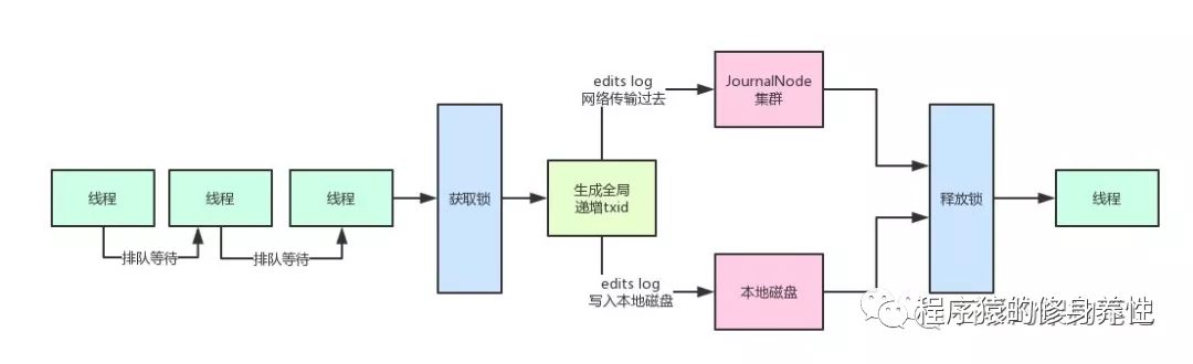 NameNode在写edits log时的第一条原则:必须保证每条edits log都有一个全局顺序递增的transactionId(简称为txid),这样才可以标识出来一条一条的edits log的先后顺序。那么如果要保证每条edits log的txid都是递增的,就必须得加锁。每个线程修改了元数据,要写一条edits log的时候,都必须按顺序排队获取锁后,才能生成一个递增的txid,代表这次要写的edits log的序号。
