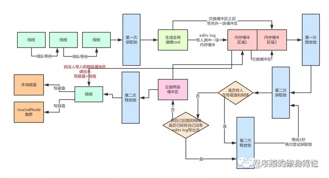 接着,之前那个幸运儿线程,将内存缓冲的区域1中的数据读取出来(此时没人写区域1了,都在写区域2),将里面的edtis log都写入磁盘文件,以及通过网络写入JournalNodes集群。这个过程可是很耗时的!但是没关系啊,人家做过优化了,在写磁盘和网络的过程中,是不持有锁的!因此后面的线程可以噼里啪啦的快速的第一次获取锁后,立马写入内存缓冲的区域2,然后释放锁。这个时候大量的线程都可以快速的写入内存,没有阻塞和卡顿!