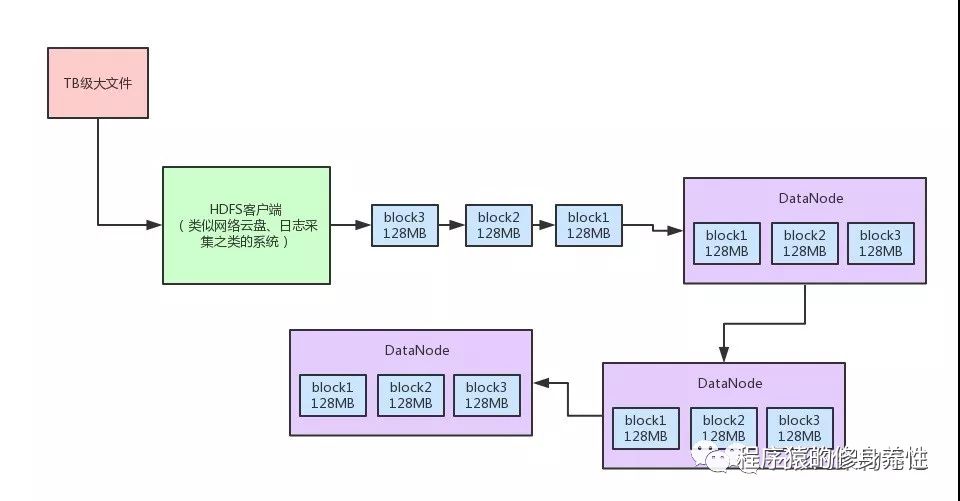 接下来再想想,HDFS客户端在NameNode内存里的文件目录树中,新加了一个文件。但是这个时候,人家要把数据上传到多台DataNode机器上去啊,这可是一个1TB的大文件!咋传呢?很简单,把1TB的大文件拆成N个block,每个block是128MB。1TB = 1024GB = 1048576MB,一个block是128MB,那么就是对应着8192个block。这些block会分布在不同的机器上管理着,比如说一共有100台机器组成的集群,那么每台机器上放80个左右的block就ok了。
