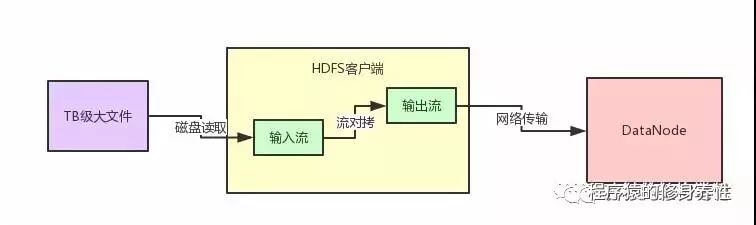 很多Java的初学者,估计都知道这样来上传文件,其实无非就是不停的从本地磁盘文件用输入流读取数据,读到一点,就立马通过网络的输出流写到DataNode里去。上面这种流程图的代码,估计刚毕业的同学都可以立马写出来。因为对文件的输入流最多就是个FileInputStream。而对DataNode的输出流,最多就是个Socket返回的OutputStream。然后中间找一个小的内存byte[]数组,进行流对拷就行了,从本地文件读一点数据,就给DataNode发一点数据。