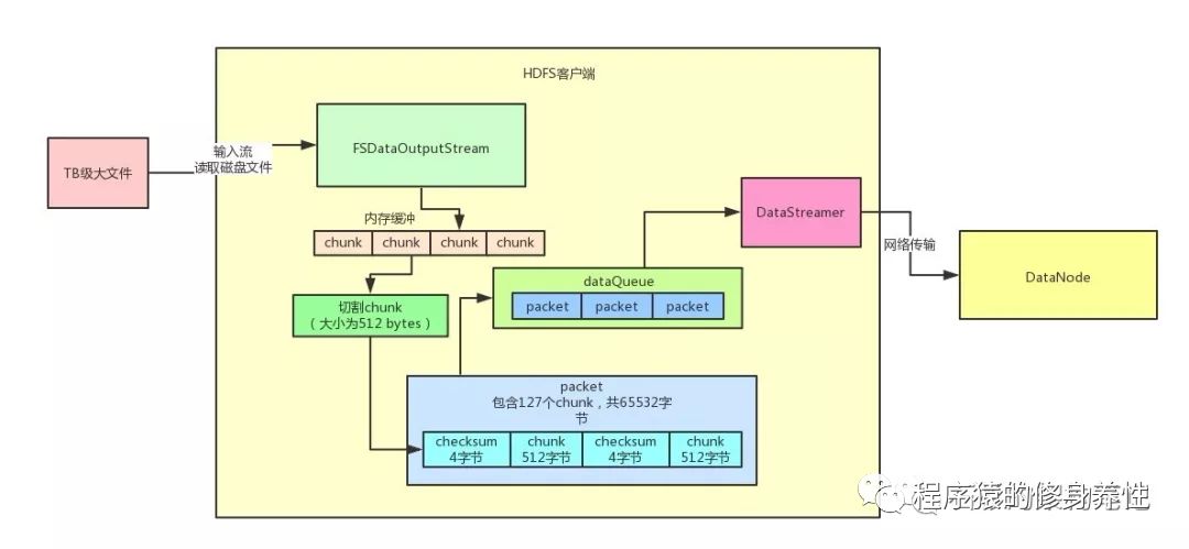 首先需要自己创建一个针对本地TB级磁盘文件的输入流。然后读到数据之后立马写入HDFS提供的FSDataOutputStream输出流。这个FSDataOutputStream输出流在干啥?大家觉得他会天真的立马把数据通过网络传输写给DataNode吗?答案当然是否定的!这么干的话,不就跟之前的那种方式一样了!