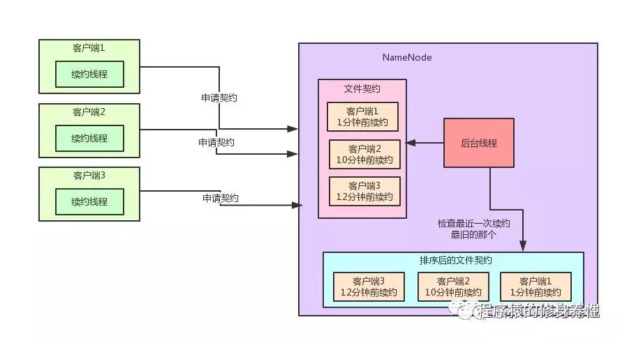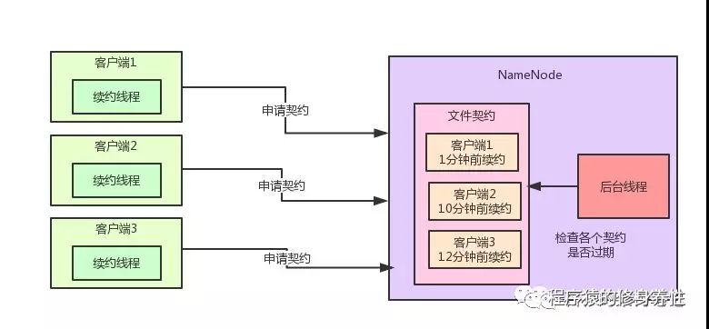 也就是说,同一时间只能有一个客户端获取NameNode上面一个文件的契约,然后才可以写入数据。此时如果其他客户端尝试获取文件契约,就获取不到,只能干等着。通过这个机制,就可以保证同一时间只有一个客户端在写一个文件。在获取到了文件契约之后,在写文件的过程期间,那个客户端需要开启一个线程,不停的发送请求给NameNode进行文件续约,告诉NameNode:NameNode大哥,我还在写文件啊,你给我一直保留那个契约好吗?而NameNode内部有一个专门的后台线程,负责监控各个契约的续约时间。如果某个契约很长时间没续约了,此时就自动过期掉这个契约,让别的客户端来写。如下图。