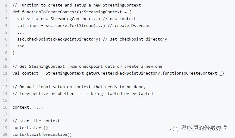 通过使用StreamingContext.getOrCreate可以达到目的,使用方法如下图所示: