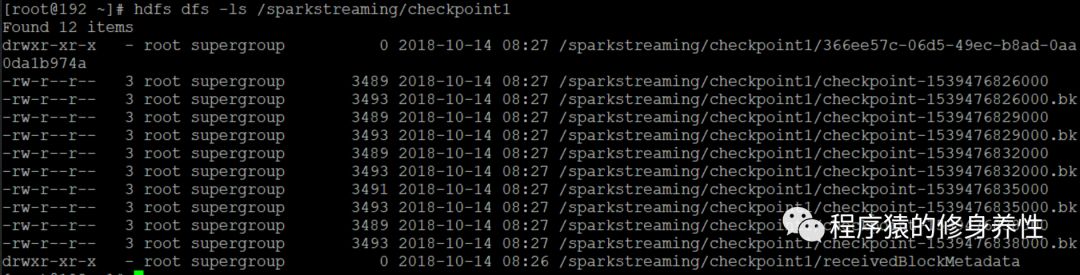 查看HDFS中检查点目录hdfs://192.168.12.221:9000/sparkstreaming/checkpoint1中保存的数据文件信息,如下图所示,/sparkstreaming/checkpoint1/receivedBlockMetadata文件中保存的便是元数据信息,其他文件中保存的是数据信息。