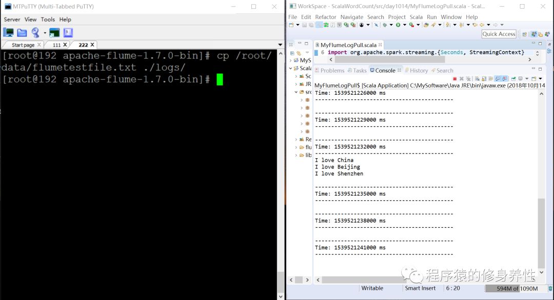 首先,运行Spark Streaming程序,监听1234号端口获取数据;然后创建一个文件flumetestfile.txt,在其中添加如下内容: