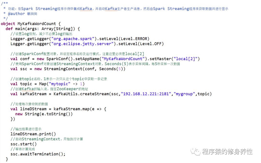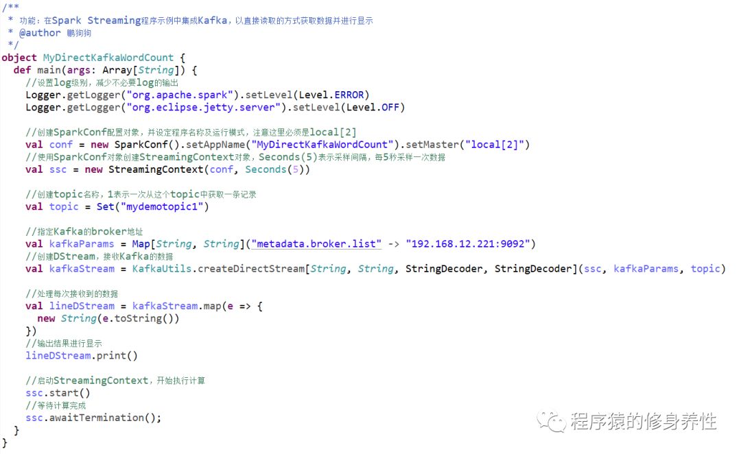 基于Kafka Receiver方式的Spark Streaming程序代码如下图所示: