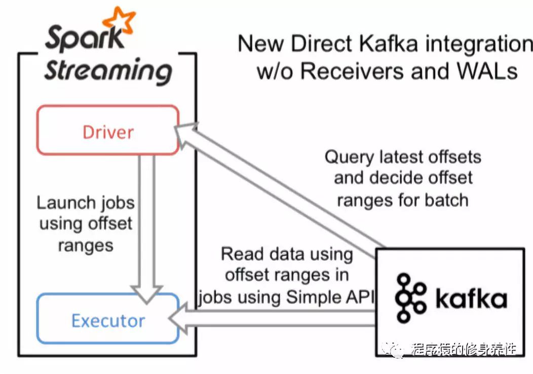 同基于Receiver接收数据的方式不一样,这种方式定期地从Kafka的topic+partition中查询最新的偏移量,再根据定义的偏移量范围在每个batch里面处理数据。当作业需要处理的数据来临时,Spark通过调用Kafka的简单消费者API读取一定范围的数据,该过程如下图所示: