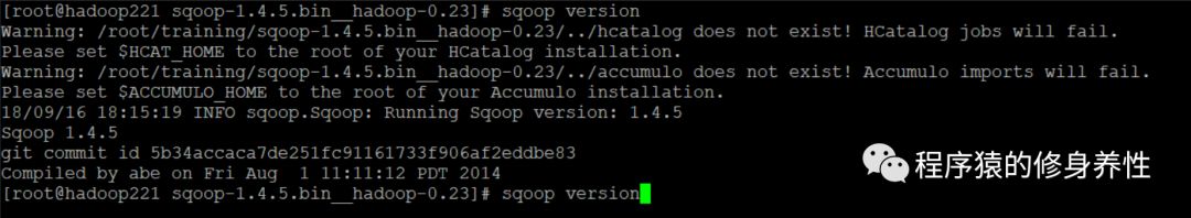 至此,Sqoop的安装和配置完成。现在来检查下Sqoop是否配置成功,运行命令sqoop version,查看当前安装的Sqoop版本信息,如下图所示: