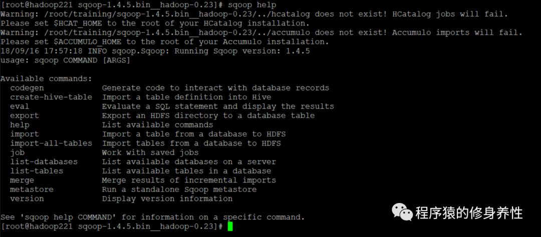 如何得知Sqoop可以完成哪些任务?Sqoop提供了一个帮助命令help,用于查看Sqoop都提供了哪些服务,运行命令sqoop help,可以看到如下图所示的内容。