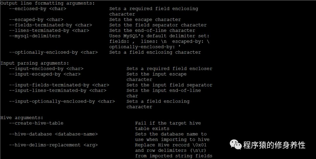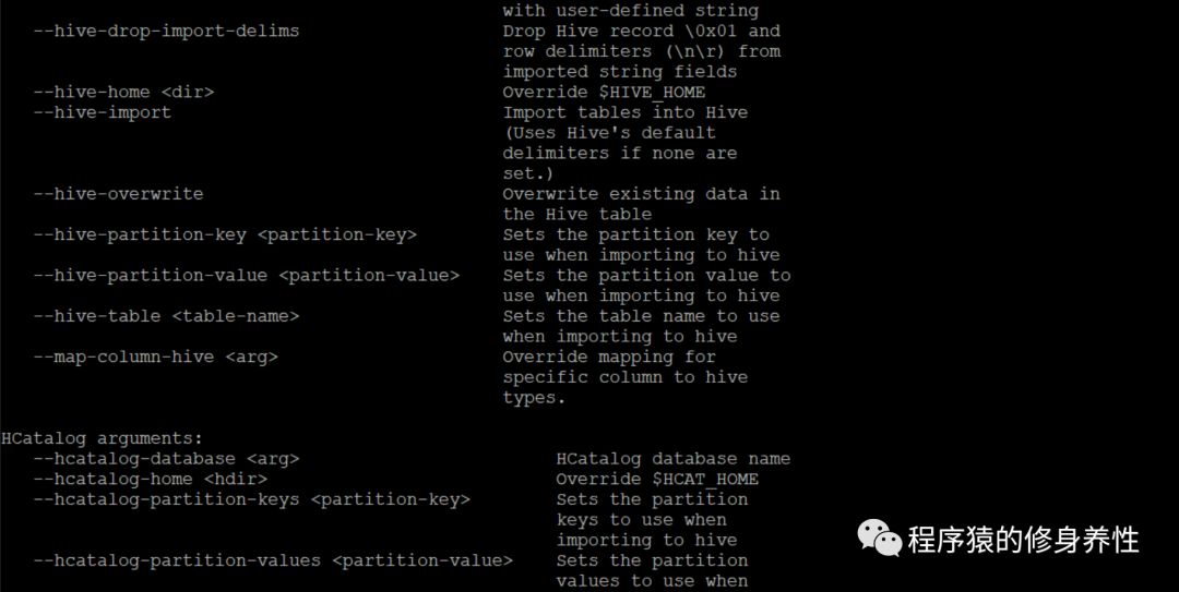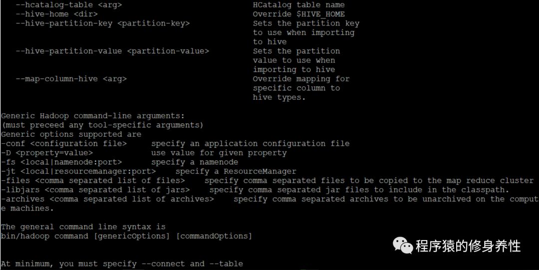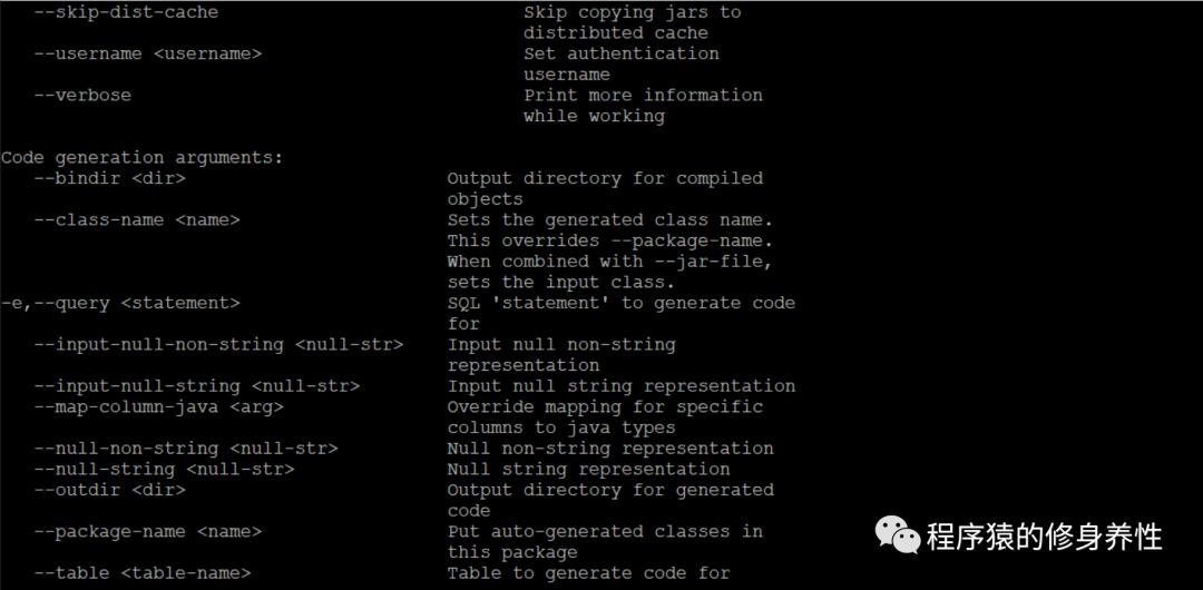针对每个具体的服务,同样可以通过help命令,查看到该服务详细的使用说明信息,如查看codegen服务的使用说明信息,运行命令sqoop codegen --help即可,如下图所示,非常详细,其中Common arguments对应通用的参数,Code generationarguments对应codegen命令可以使用的参数等等。
