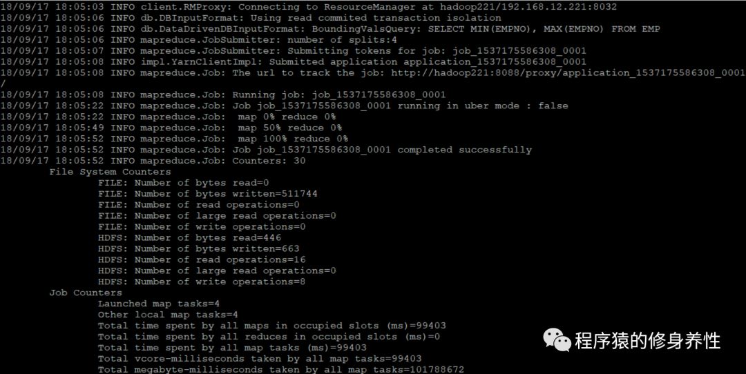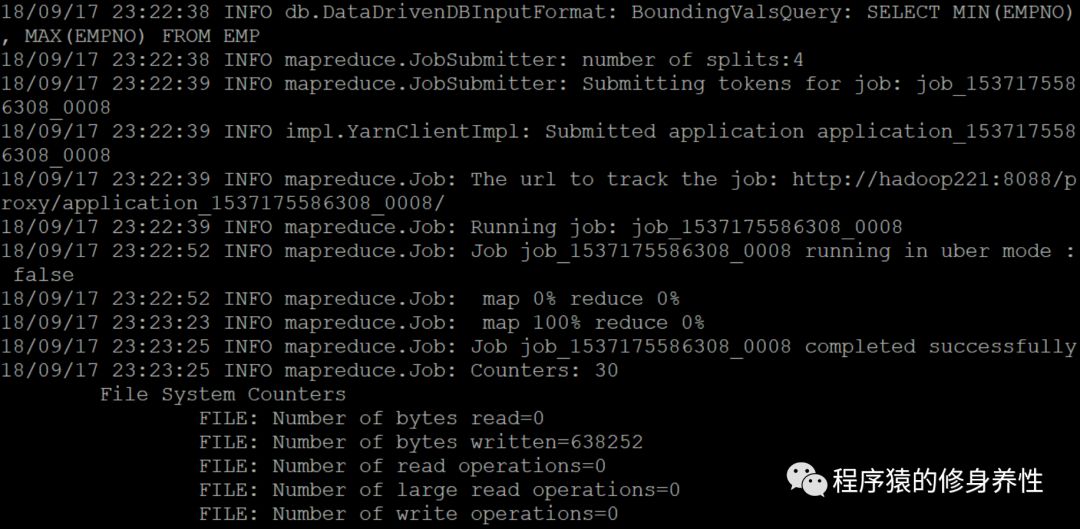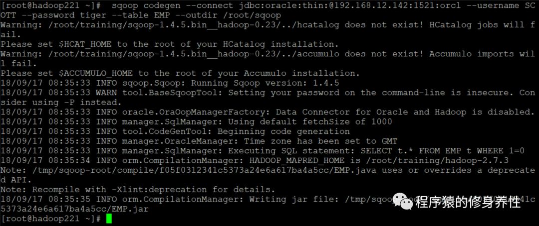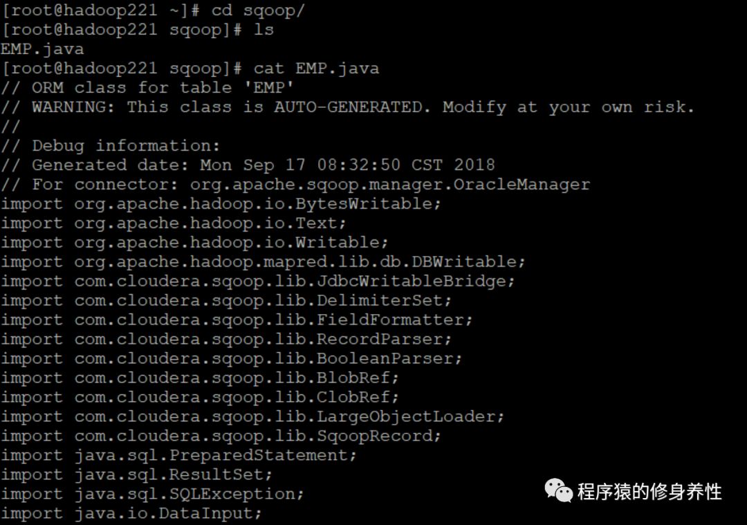 输出的log如下图所示,同时Sqoop在指定的/root/sqoop目录下生成了EMP.java类文件,在目录/tmp/sqoop-root/compile/f05f0312341c5373a24e6a617ba4a5cc下生成了EMP.jar包。