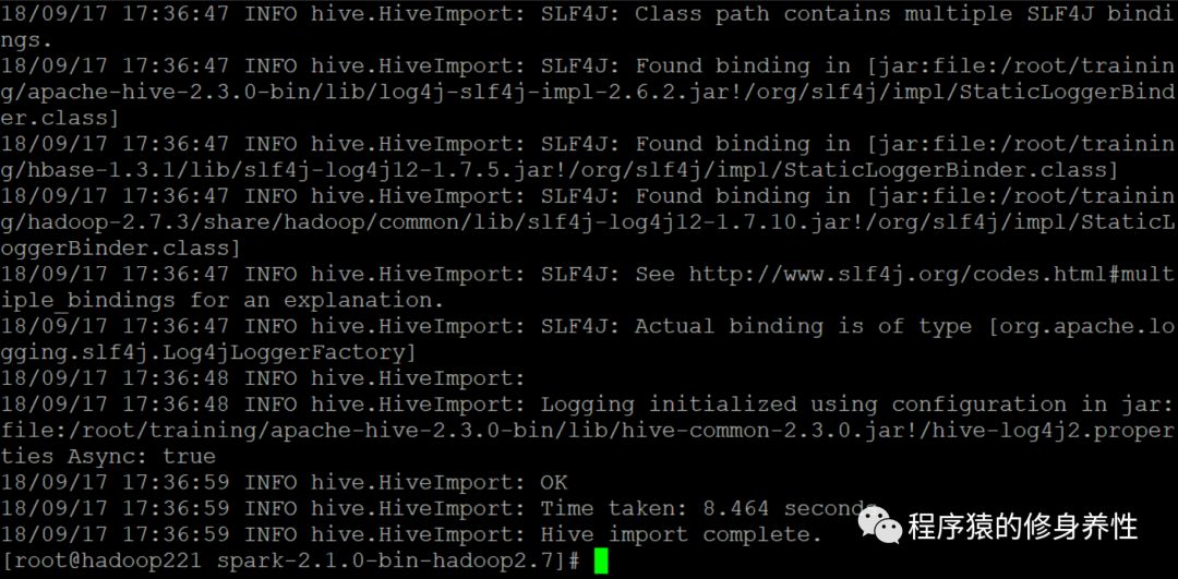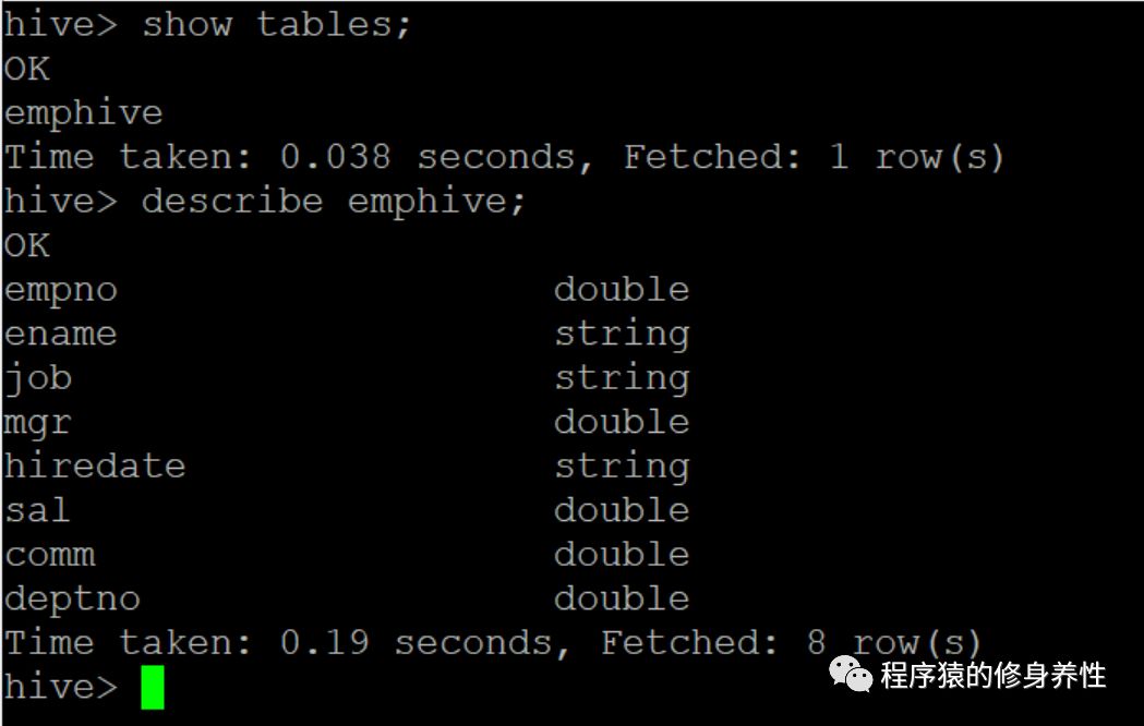 --hive-table参数用于指定创建的Hive表的名称,--fields-terminated-by参数用于指定Hive表中每行数据的分隔符,这里以空格进行分隔。输出的log信息及在Hive中创建的表结构信息如下图所示。