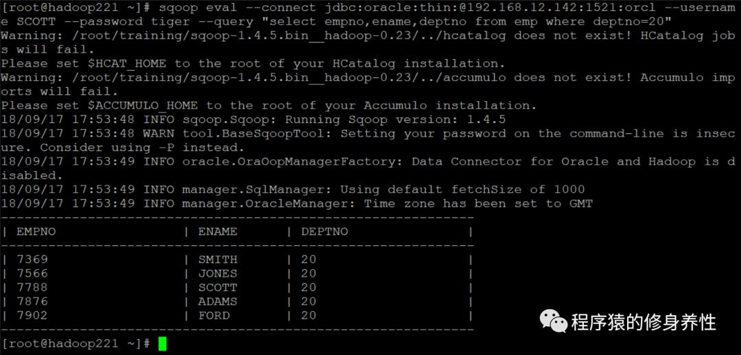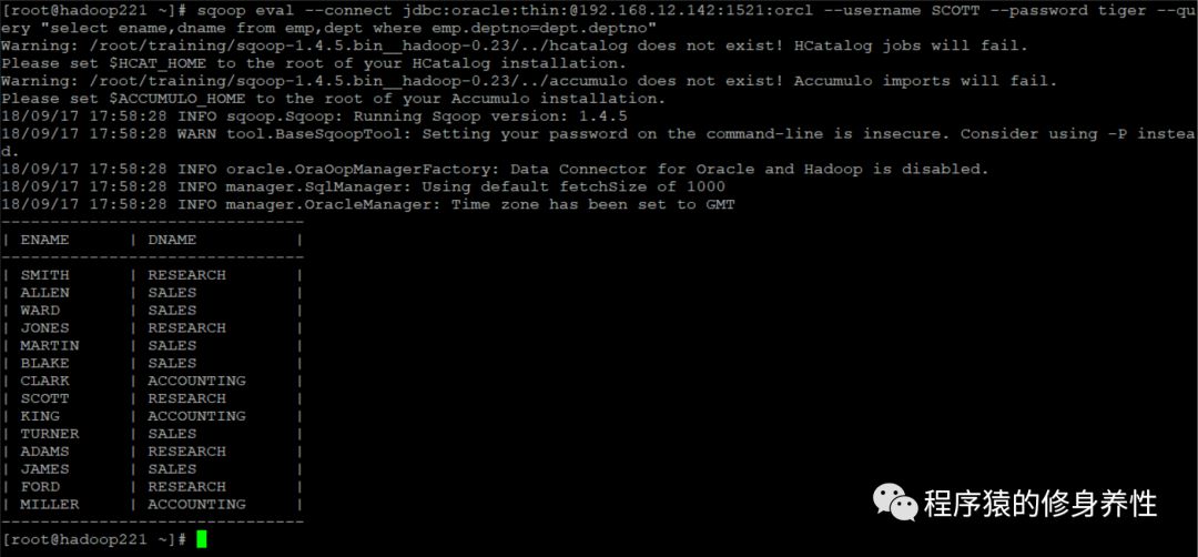 sqoop eval --connectjdbc:oracle:thin:@192.168.12.142:1521:orcl --username SCOTT --password tiger--query "select ename,dname from emp,dept whereemp.deptno=dept.deptno"