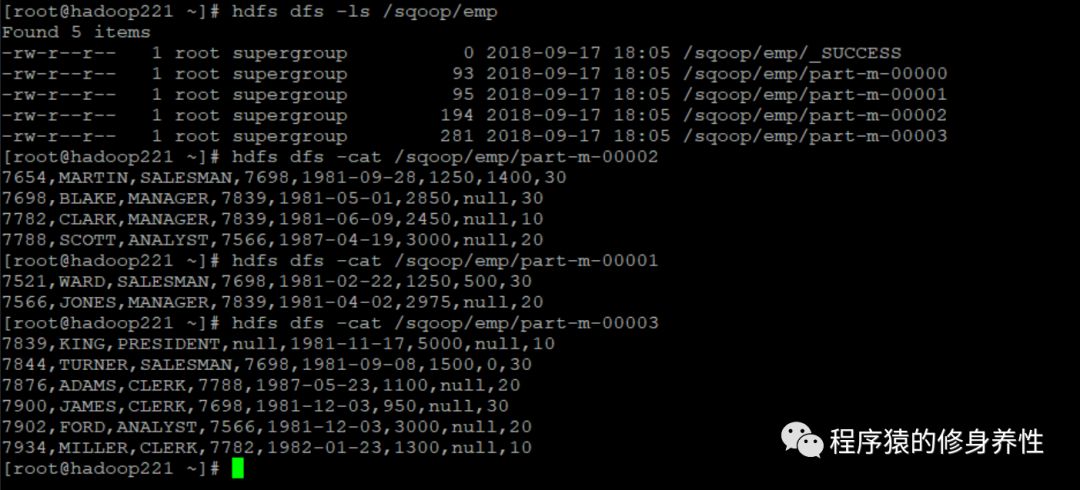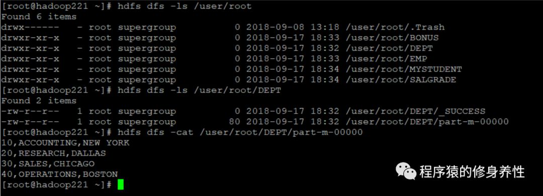 Sqoop是一个工具,它提供了很多非常实用的服务,通过这些服务可以方便地将数据在RDBMS与HDFS之间转移,下面将简单讲述这些服务的基本使用。准备工作,进入主机hadoop221的/root目录下,新建sqoop目录,专门用于存放sqoop相关的数据文件。这里需要注意的是,本文使用的关系型数据库是Oracle,因此在使用sqoop相关命令时,涉及到Oracle数据库的用户名、表名以及列名都需要大写,如果使用的是其他关系型数据库(如MySQL),则没有这个要求。