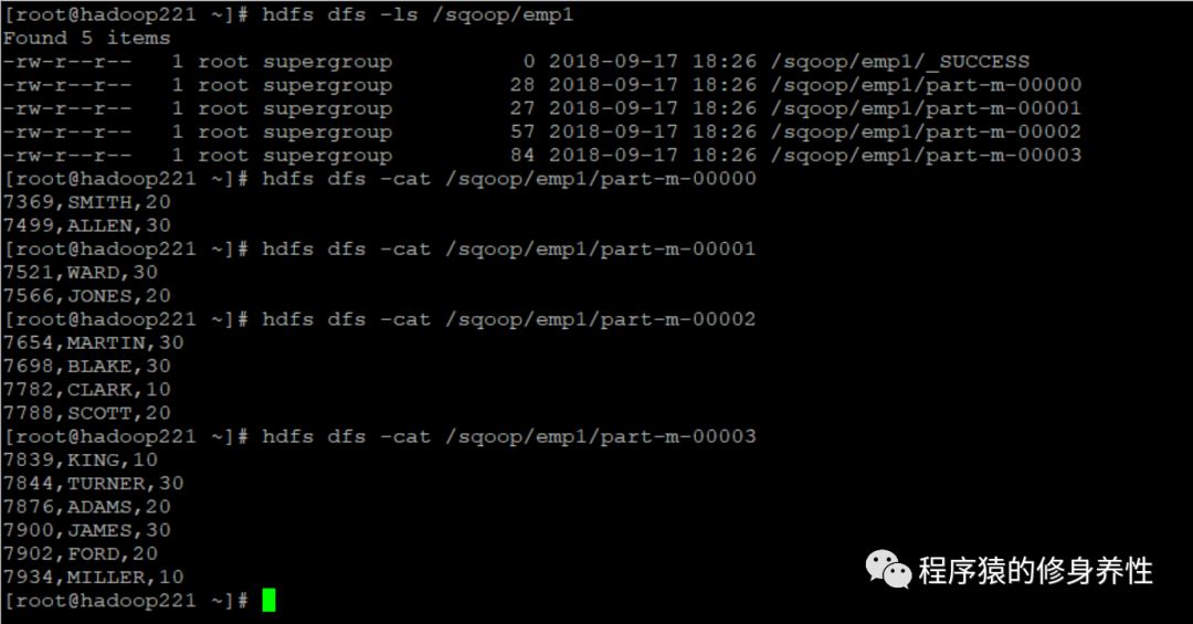 -m参数用于指定MapReduce任务只启动一个map进程,对应也就只在HDFS上建立一个分区,最终在HDFS上就只会产生一个文件。从产生的log信息可以看到,在执行该命令的过程中,连续产生了多个MapReduce任务,最终在HDFS上生成的文件内容如下图所示。可以看出,针对数据库中的每张表,都会在HDFS指定目录下生成一个目录,并将各张表中的数据保存到对应目录下。
