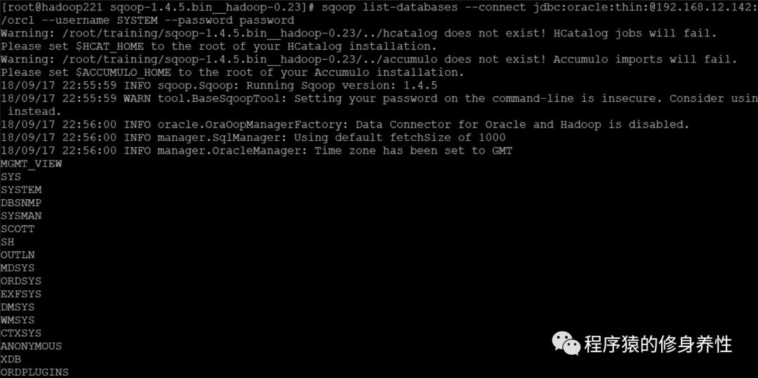 sqoop list-databases --connectjdbc:oracle:thin:@192.168.12.142:1521/orcl --username SYSTEM --passwordpassword