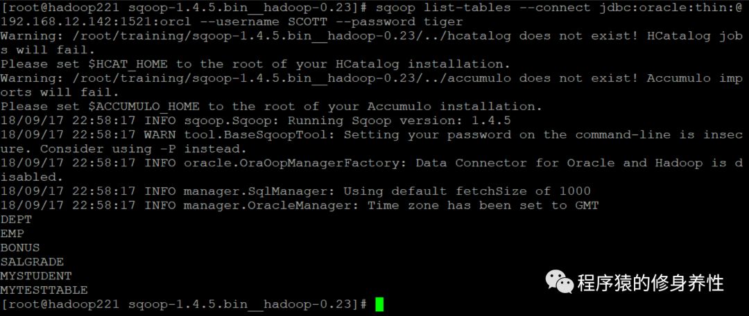 sqoop list-tables--connect jdbc:oracle:thin:@192.168.12.142:1521:orcl --username SCOTT--password tiger
