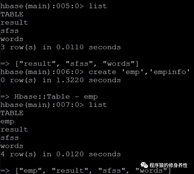 import服务还有个比较特别的作用,它能够将数据从关系型数据库表中导入到HBase中,不过在导入数据到HBase之前,需要先在HBase中创建好相应的数据表,如下图所示: