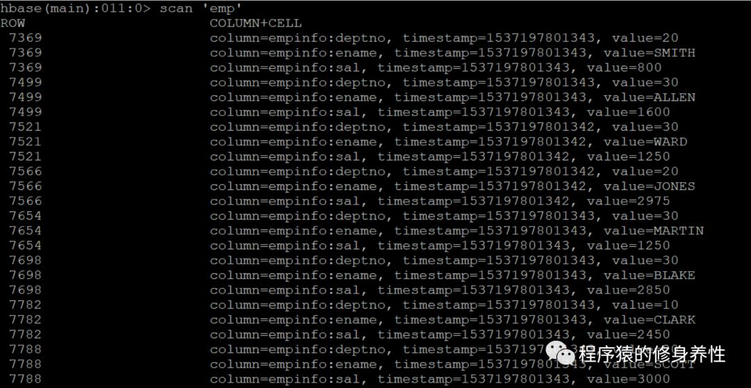 查看HBase中的emp表,部分内容如下图所示: