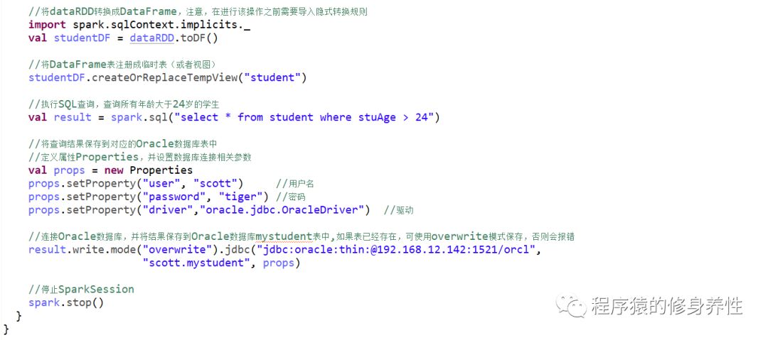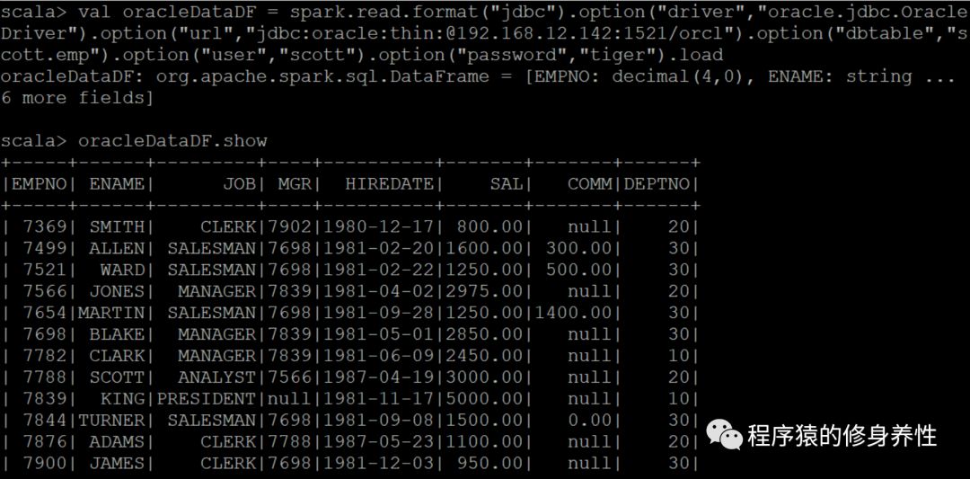 val oracleDataDF =spark.read.format("jdbc").option("driver","oracle.jdbc.OracleDriver").option("url","jdbc:oracle:thin:@192.168.12.142:1521/orcl").option("dbtable","scott.emp").option("user","scott").option("password","tiger").load