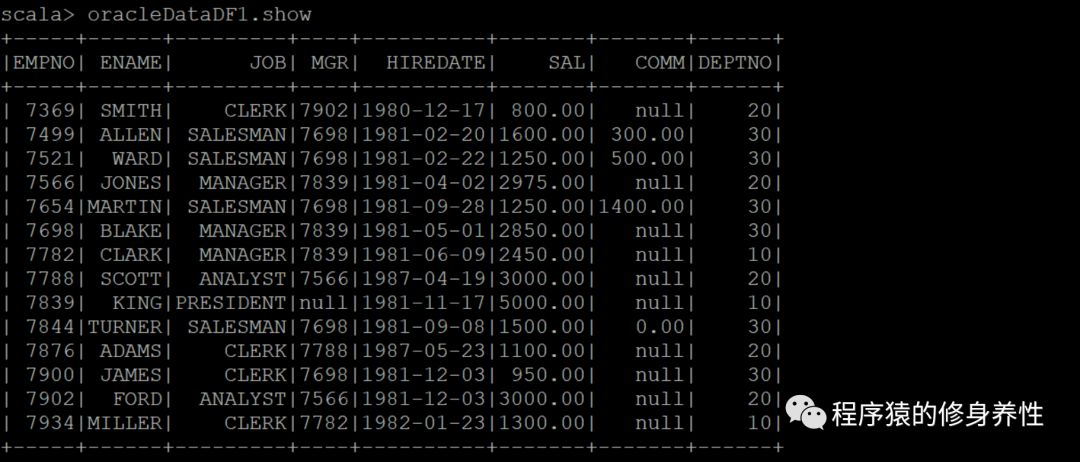 然后运行命令oracleDataDF.show,查看从Oracle数据库中获取的数据内容,运行结果如下图所示: