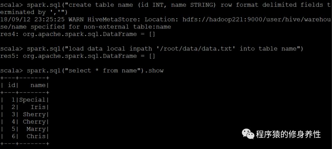 保存退出。运行命令spark.sql("create table name(id INT, name STRING) row format delimited fields terminated by ','"),在Hive中创建对应的人名表name,然后往新创建的表name中导入数据,运行命令spark.sql("load data local inpath '/root/data/data.txt' into table name"),将测试数据文件data.txt中的内容导入到name表中,最后运行命令spark.sql("select * from name").show,查询表name中的所有数据,运行结果如下图所示: