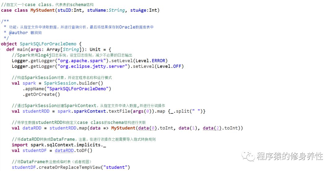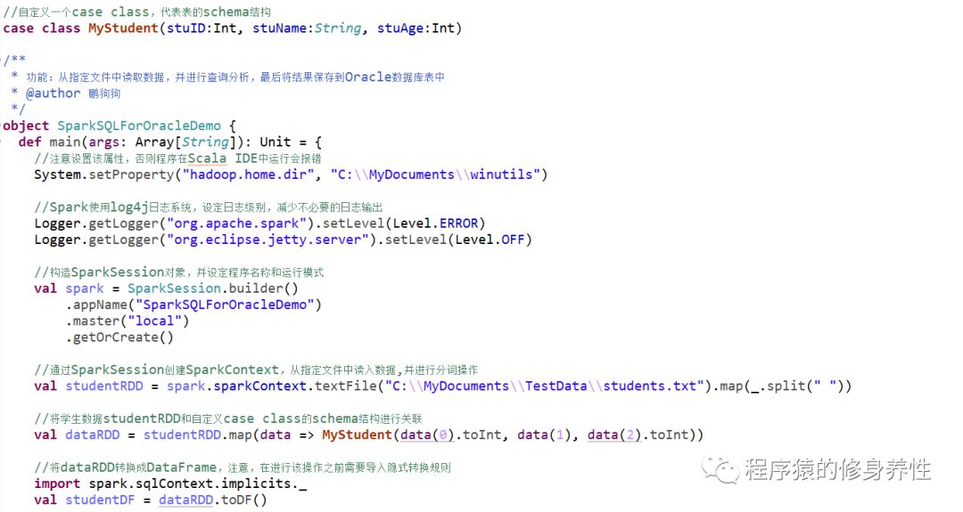 上一篇文章中讲过一个SparkSQL编程实例,实现的功能是从C:\\MyDocuments\\TestData\\students.txt文件中读取数据,然后进行分析处理,最后将查询的结果显示到控制台。下面重新实现该SparkSQL程序,只不过这里将最终查询的结果保存到Oracle数据库表中。并且,这里简单介绍下该SparkSQL程序的两种运行方式,其一是本地运行(直接在Scala IDE中运行);其二是提交任务到Spark集群上运行。