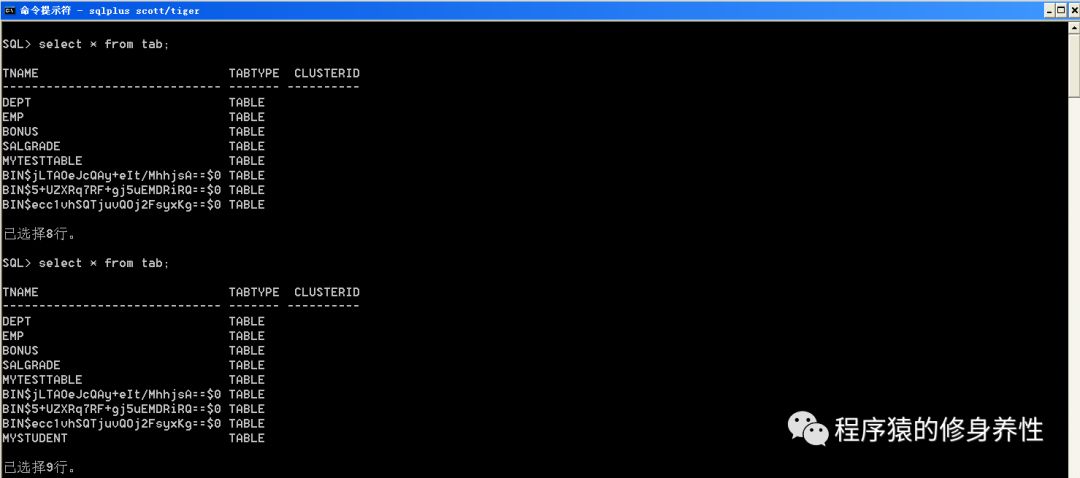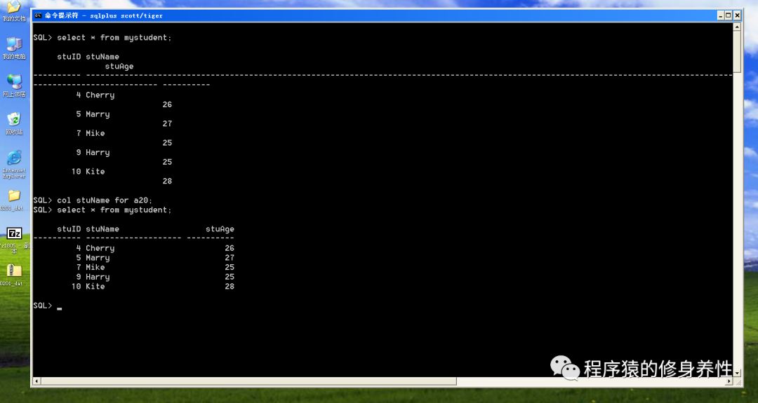 程序执行完后,到Oracle的sqlplus命令行进行查看,结果如下图所示。事先未在Oracle数据库中创建相应的mystudent表,而是由SparkSQL程序自动创建,这个从下图中也可以看出来。同时,由于mystudent表是SparkSQL程序自动创建,表的格式会存在一些问题,导致显示不太友好,通过设置列宽(col stuName for a20,表示将列stuName设置为最多显示20个字符)可以进行调整,使得最终查询结果的显示更完美。