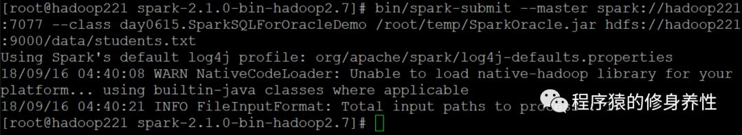 编写完程序后,导出为SparkOracle.jar包,然后上传到主机hadoop221的/root/temp目录下,进入到/root/training/spark-2.1.0-bin-hadoop2.7目录下,最后运行命令bin/spark-submit --master spark://hadoop221:7077 --class day0615.SparkSQLForOracleDemo /root/temp/SparkOracle.jar hdfs://hadoop221:9000/data/students.txt,等待程序执行完成即可。输出的log如下图所示,程序的运行结果跟前面一致,这里不再给出。