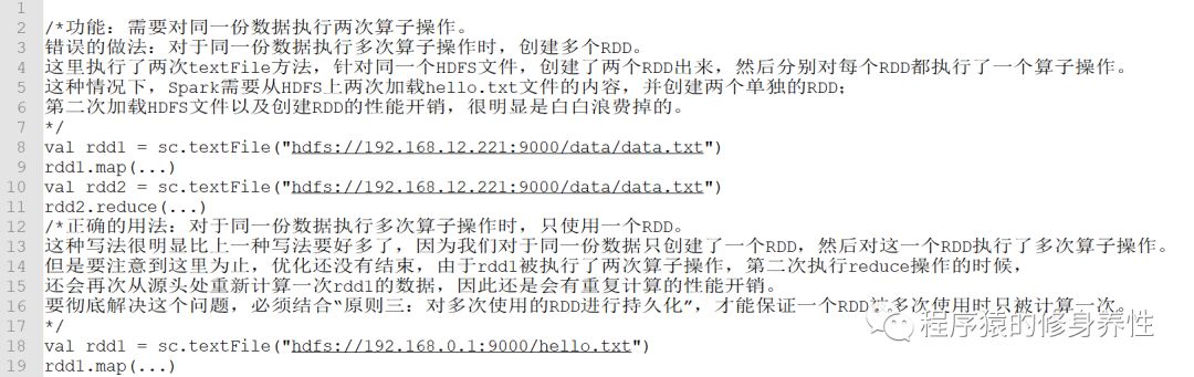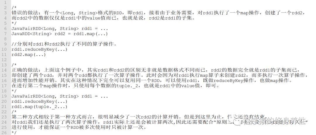 通常来说,在开发一个Spark作业时,首先是基于某个数据源(比如Hive表或HDFS文件)创建一个初始的RDD;接着对这个RDD执行某个算子操作,然后得到下一个RDD,以此类推,循环往复,直到计算出最终需要的结果。在这个过程中,多个RDD会通过不同的算子操作(比如map、reduce等)串起来,这个“RDD串”,就是RDD lineage,也就是“RDD的血缘关系链”。在开发过程中要注意:对于同一份数据,只应该创建一个RDD,不能创建多个RDD来代表同一份数据。