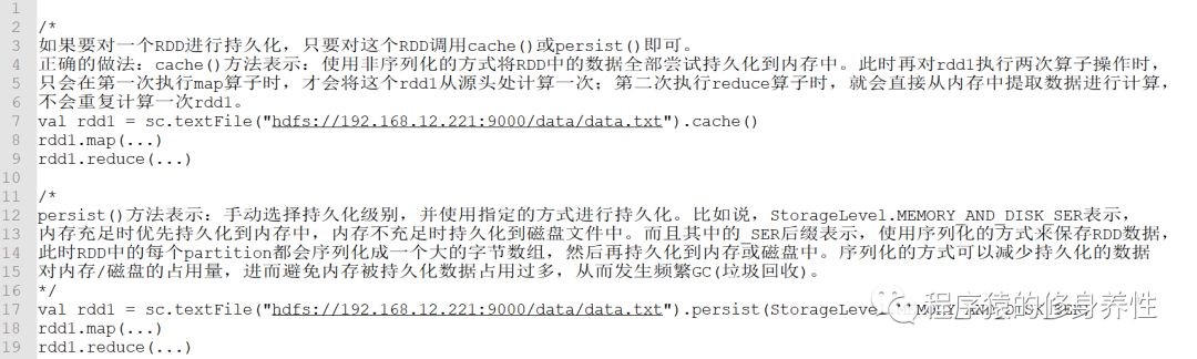 因此对于这种情况,给出的建议是:对多次使用的RDD进行持久化。此时Spark就会根据你的持久化策略,将RDD中的数据保存到内存或者磁盘中,以后每次对这个RDD进行算子操作时,都会直接从内存或磁盘中提取持久化的RDD数据,然后执行算子,而不会从源头处重新计算一遍这个RDD,再执行算子操作。
