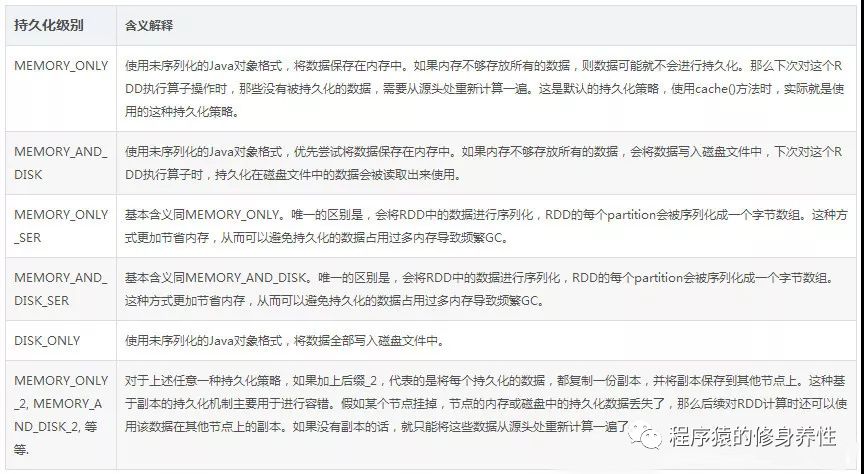 对于persist()方法而言,可以根据不同的业务场景选择不同的持久化级别,这样更具有灵活性。Spark的持久化级别如下图所示: