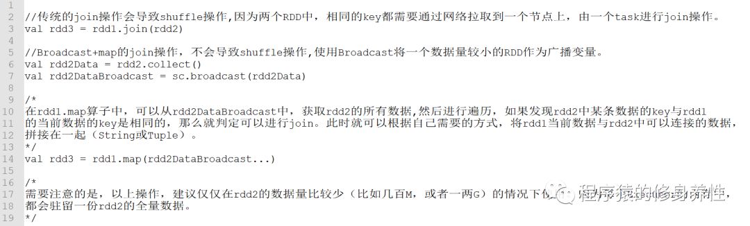 所以在平时的开发过程中,能避免则尽可能避免使用reduceByKey、join、distinct、repartition等会进行shuffle的算子,尽量使用map类的非shuffle算子。这样的话,没有shuffle操作或者仅有较少shuffle操作的Spark作业,可以大大减少性能开销。如下示例使用Broadcast与map进行join操作。