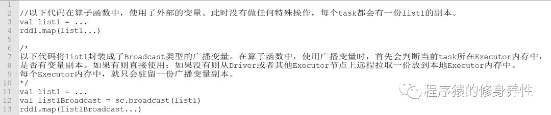 因此对于上述情况,如果使用的外部变量比较大,建议使用Spark的广播功能,对该变量进行广播。广播后的变量,会保证每个Executor的内存中,只驻留一份变量副本,而Executor中的task执行时共享该Executor中的那份变量副本。这样的话,可以大大减少变量副本的数量,从而减少网络传输的性能开销,并减少对Executor内存的占用开销,降低GC的频率。