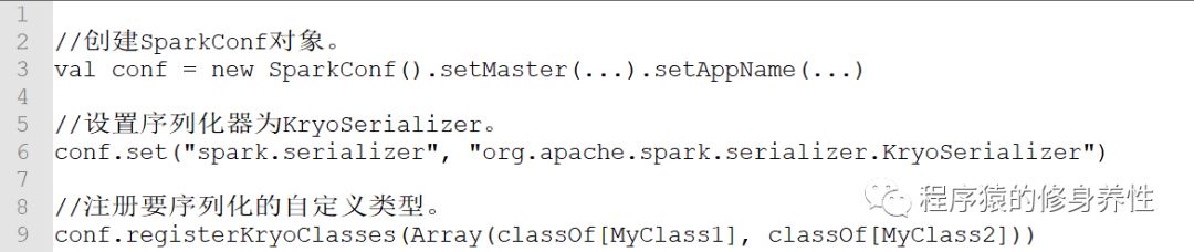 下面是使用Kryo的代码示例,只要设置序列化类,再注册要序列化的自定义类型即可(比如算子函数中使用到的外部变量类型、作为RDD泛型类型的自定义类型等)。