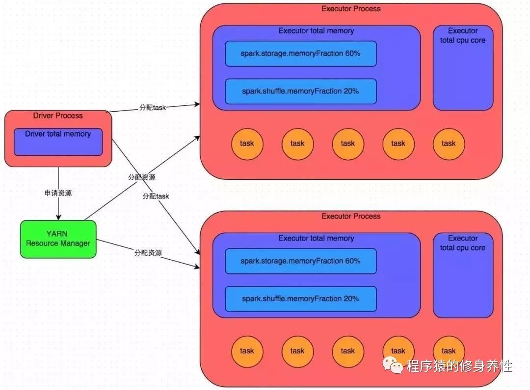 总之,无论是哪种情况,都会导致Spark作业的运行效率低下,甚至根本无法运行。因此必须对Spark作业的资源使用原理有一个清晰的认识,并知道在Spark作业运行过程中,有哪些资源参数是可以设置的,以及如何设置合适的参数值。